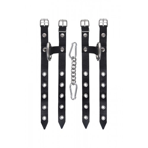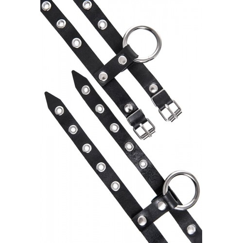 Однослойные кожаные наручники из двух ремешков могут стать стильным аксессуаром на «свободных» руках, но могут послужить вашим целям и фантазиям по своему прямому назначению. Наличие двух колец и карабинов, соединенных между собой металлической цепочкой, позволяет использовать изделие как раздельно – аксессуар-манжеты, так и как наручники для фиксации. К широким металлическим кольцам также можно присоединить и другие аксессуары при помощи карабинов. Благодаря универсальному размеру наручники могут использоваться и мужчинами, и женщинами. Размер легко регулируется с помощью металлических пряжек, органично вписывающихся в общий стиль. Ширина ремешков 1,6 см, длина манжет 25 см.