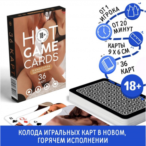 Оригинальная колода игральных карт «HOT GAME CARDS» с иллюстрациями в стиле Камасутры — необычный аксессуар для весёлого и непринуждённого досуга. В комплект входит 36 карт с изображениями, выполненными в художественном стиле, которые придают играм пикантный оттенок и создают повод для улыбки и флирта.