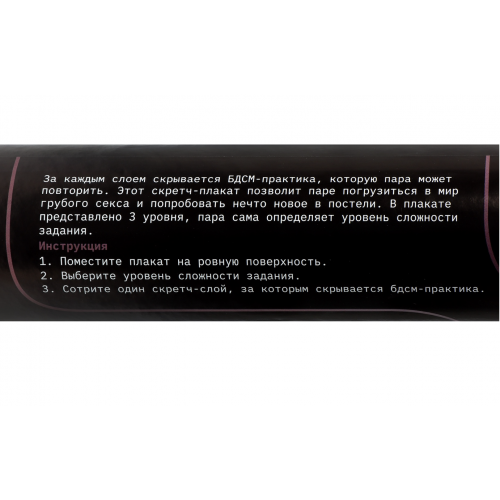 Плакат со скретч-слоем «БДСМ» — это интригующее приключение для двоих, которое открывает двери в мир страсти, подчинения и игры с властью. Он создан для пар, стремящихся к новому уровню откровенности, доверия и удовольствия.