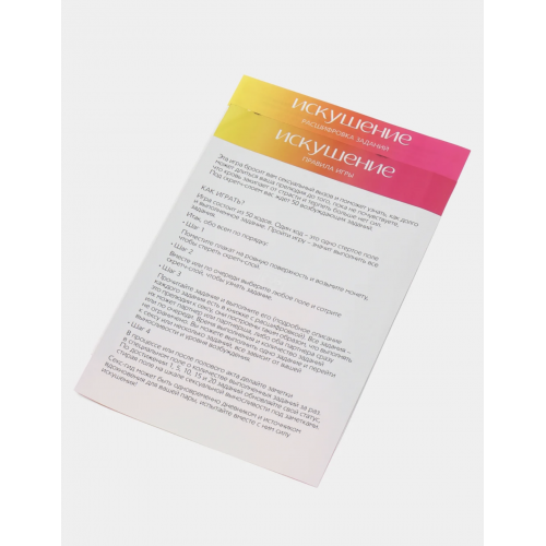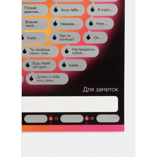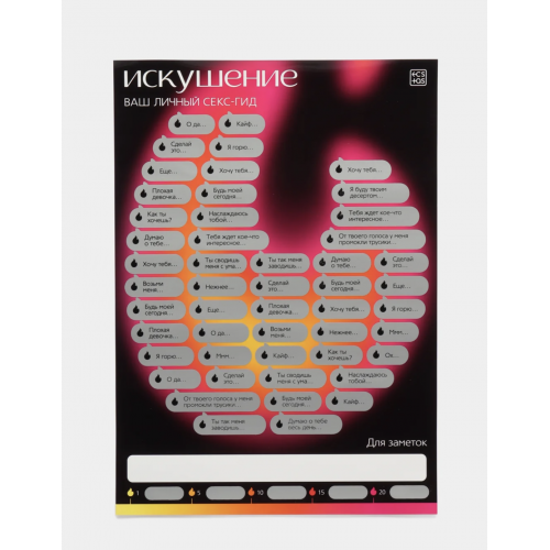 Под слоями плаката скрыты 50 заданий — от лёгких намёков и романтических идей до по-настоящему откровенных испытаний для двоих. Вас ждут сюжеты с элементами флирта, ролевые сценарии, смелые позы и желания, о которых раньше, возможно, не решались даже говорить. Просто выберите участок, сотрите защитное покрытие и позвольте моменту увлечь вас обоих.