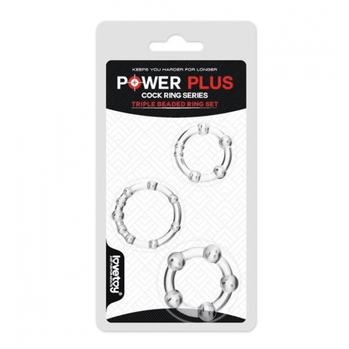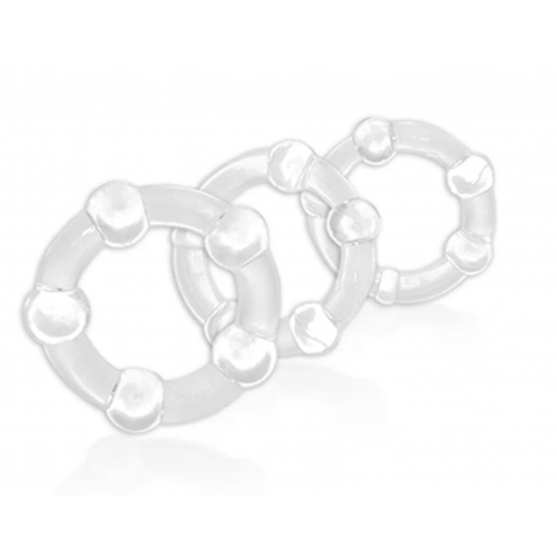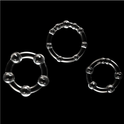 Набор из трёх эластичных колец для внешней стимуляции и фиксации у основания. Кольца можно использовать по одному или комбинировать: на основании пениса и/или на мошонке. Дополнительные рельефные элементы создают ощутимую текстуру при поступательных движениях. Материал — термопластичный эластомер (ТПЭ), мягкий и растяжимый, быстро адаптируется к температуре тела.