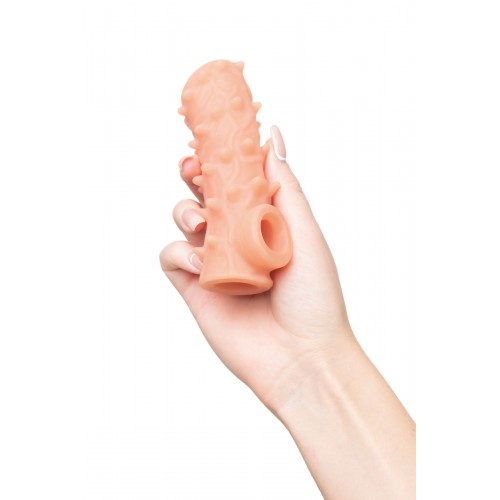 Насадка имеет форму “рукав”, плотно прилегает к пенису, создавая дополнительную толщину и оставляя головку открытой. Это позволяет сохранить чувствительность головки, задерживая эякуляцию. В основании есть отверстие для мошонки, с помощью которого вы надежно зафиксируете насадку на пенисе, не ограничиваясь в активных движениях. Насадка, за счет плотного облегания мошонки и головки, усиливает эрекцию.