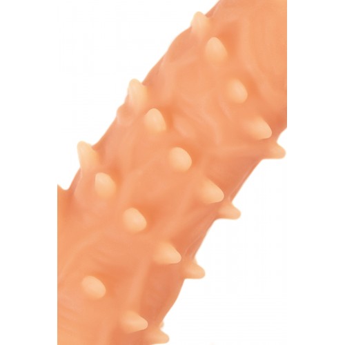 Ярко выраженный рельеф в виде многочисленных выпуклых вен и мягких шипов по всему стволу насадки стимулирует зону G, вход во влагалище и настойчиво ласкает чувствительные зоны. Дополнительный объем дарит то самое чувство наполненности, увеличивая поток возбуждения. Мужчина тоже будет ощущать стимуляцию за счет давления стенок влагалища на пенис.